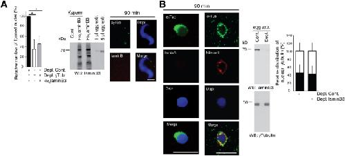 Fig. 6. γ-Tubulin promotes the formation of the nuclear envelope in the absence of lamin B3. (A) His6–lamin B3 (laminB3) was added back to Ksperm (Cont.; Ksperm without laminB3) and γ-tubulin immunodepleted egg extract (Depl.) and nuclear assembly was performed as in Fig. 5. Graph shows the mean percentage of formed nuclei in stage 3 and 4 in immunodepleted egg extracts and sperm (Depl. γTub) versus a control (black bar; Depl. Cont.), with addition of His6–lamin B3 (grey bar) to the γ-tubulin depleted extracts (± s.d., n = 3; * p < 0.05), as indicated. The western blot shows the amount of His6–lamin B3 added to sperm. To relate the amount of His6–lamin B3 to the amount present in extracts, 1 μl and 5 μl of egg extracts were loaded. Representative confocal fluorescence images of morphological changes of nuclei show the location of endogenous γ-tubulin (eγTub, green) or lamin B (red). (B) Representative confocal fluorescence images of morphological changes of nuclei in nuclear assembly reactions that were triggered by addition of lamin B3 immunodepleted egg extracts to sperm and incubated 90 min before fixation. The protein levels of lamin B3 in extracts were analyzed by WB. The graph shows the mean percentage of formed nuclei with γ-tubulin localized throughout the nuclei (black bar) or marginalized to the nuclear envelope (open bar) (± s.d., n = 3). (A, B) Localization of γ-tubulin (eγTub; green), His6–lamin B3 (lamin B; red) and lamin B3 (lamin B; red) were examined by immunofluorescence staining with the indicated antibody and nuclear membranes and nuclei were detected with Nile red (red) and DAPI (blue), respectively. The figure shows representative images from at least five experiments. Scale bars, 10 μm. |