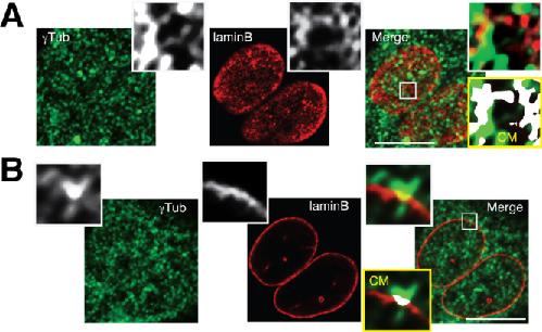 Fig. 7. Endogenous γ-tubulin bridges connect both the nuclear and the cytosolic γ-tubulin pools across the nuclear envelope. (A, B) Localization of endogenous γ-tubulin with an anti-γ-tubulin (T3320; green), lamina with an anti-lamin B (laminB; red) antibody and nuclei with DAPI (blue) were examined in U2OS cells in interphase. Confocal images are the mid planes of the γ-tubulin boundary at the nuclear membrane (A) or of the nuclear compartment (B) of a U2OS cell. White and yellow boxes show the magnified areas and colocalization pixel-map (CM) of the red and green channels of the magnified areas displayed in the inset, respectively. White areas in CM denote colocalized pixels between channels. The figure shows representative images from at least five experiments. Scale bars, 10 μm. |