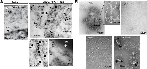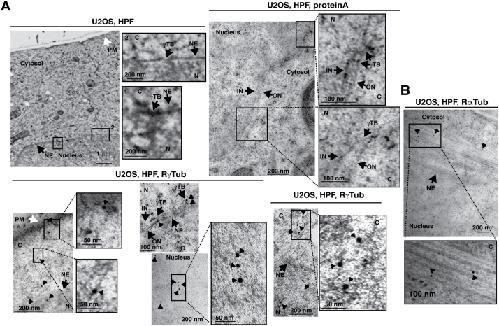 Fig. 11. The cytosolic and the nuclear pools of γ-tubulin are connected and form one protein meshwork. (A, B) Endogenous γ-tubulin detection in immunoelectron microscopy using three different conditions in high pressure frozen (HPF) U2OS cells: first, no antibody (A), second, gold conjugated protein A (A) and third, an anti-γ-tubulin antibody (T3320; A) and gold conjugated protein A (RγTub; A) or an anti-α-tubulin antibody and gold conjugated protein A (RαTub; B). Images show the plasma membrane [PM], cytosol [C], nuclear envelope [NE], inner [IN] and outer [ON] nuclear membranes and nucleus [N] and γ-tubulin bridges [γTB] of a U2OS cell. A black box shows the magnified area displayed in the inset. Black arrowheads show either immunolabeled γ-strings (RγTub) or immunolabeled microtubules (RαTub). Arrows show the indicated structure (n = 3). |