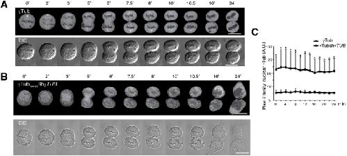 Fig. 16. The endogenous protein levels of γ-tubulin affect the association of GFP-γ-tubulin to chromatin. (A, B) The DIC/fluorescence images show time-lapse series from U2OS cells that stably expressed either C-terminal tagged GFP-γ-tubulin (γTub; A) or both γTUBULIN shRNA and N-terminal tagged GFP-γ-tubulinresist (γTubresistShγTUB; B). The image series show chosen frames of the variation over time in the amount of chromatin-associated GFP-γ-tubulin. Images were collected every 30 sec. Scale bars, 10 μm. (C) The graph shows the time dependent changes in fluorescence intensity across the chromatin of GFP-γ-tubulin expressed in arbitrary units (AU; mean ± s.d.; n = 3). |