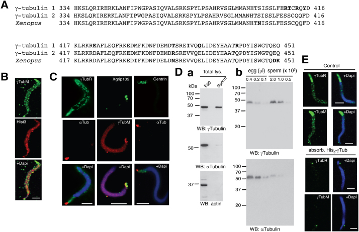 Fig. 1. Demembranated sperm contains γ-tubulin. (A) Sequence alignment of the variable region of human γ-tubulin 1 and γ-tubulin 2 and Xenopus laevis γ-tubulin, showing residues 334–451 of the C terminal region. Bold letters indicate differences. (B, C) The localization of γ-tubulin, histone 3, γ-tubulin ring complex (Xgrip109) and centrosome (centrin and αTub) were immunofluorescence stained in demembranated sperm (n = 5) with an anti-γ-tubulin antibody that was produced either in rabbit (γ-TubR; T3320) or mouse (γ-TubM; ab27074). (Da) Total lysates of egg extract and demembranated sperm were analyzed by western blotting with the indicated antibodies (n = 3; T3320). An actin and α-tubulin loading controls are shown. (Db) The indicated amount of egg extract (egg) and demembranated sperm (sperm) was analyzed by western blotting with the indicated antibodies (n = 6; T3320). An α-tubulin loading control is shown. (E) The anti-γ-tubulin antibody produced in rabbit or mouse (T3320 and ab27074) were preincubatd for 2 h with Ni2+ affinity resin (control) or with Ni2+ affinity resin associated with His6-tagged γ-tubulin (absorb. His6-γ-Tub) before immunofluorescence staining the sperm. In (B, C, E) γ-tubulin is shown as green and histone 3 as red and nuclei as blue (DAPI). In (C) Xgrip109 and γTub are shown as green and red, respectively. Scale bars, 10 μm. |