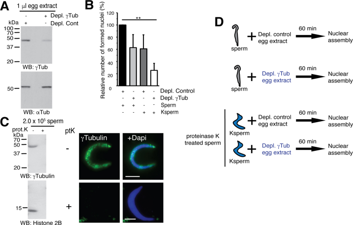 Fig. 3. Nuclear γ-tubulin is necessary for nuclear assembly. (A) Nuclear assembly was performed as in Fig. 2B. Egg extracts (egg extr.) were immunodepleted in the presence (Depl. γTub) or absence (Depl. Cont.) of an anti-γ-tubulin antibody by immunoprecipitation and protein levels of γ-tubulin and α-tubulin were analyzed by WB (n = 6). (B) Graph shows the mean percentage of formed nuclei in stage 3 and 4 relative to a control (black bar) in nuclear assembly reactions that were performed under the conditions described in D (± s.d., n = 3, ** p < 0.01). (C) Proteins associated with the demembranated sperm were degraded with proteinase K (ptK; Ksperm), as indicated and remaining protein levels of γ-tubulin and histone 2B were analyzed by western blotting (WB). The localization of γ-tubulin and chromatin in sperm were assayed by immunofluorescence with an anti-γ-tubulin antibody (green; ab27074) and by DAPI staining (blue; n = 3). (D) Schematic representation describing the conditions used during nuclear assembly assays. The figure shows representative images from at least ten experiments. Scale bars, 10 μm. |