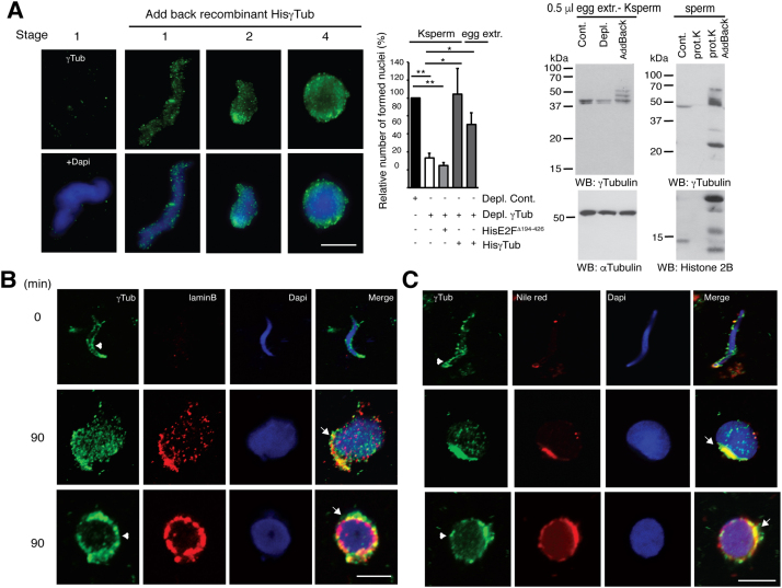 Fig. 4. Recombinant γ-tubulin restores nuclear assembly. (A) Nuclear assembly was performed as in Fig. 3. Bacterially produced His6–γ-tubulin (HisγTub) or His6–E2F1Δ194−426 (HisE2FΔ194−426) was added back (addback) to Ksperm or to immunodepleted egg extract (egg extr.) and the effects of His6–γ-tubulin on nuclear assembly were examined. The protein levels of γ-tubulin in extracts (egg extr.-Ksperm) or sperm were analyzed by WB as indicated. An α-tubulin (αTub) loading control is shown (n = 3-6). Graphs show mean percentage of formed nuclei in stage 3 and 4 relative to a control (black bar) from nuclear assembly reactions that consisted of immunodepleted egg extracts and sperm or Ksperm, in which an anti-γ-tubulin antibody (open bar; T3320) or an anti-γ-tubulin antibody that after immunodepletion, either His6–γ-tubulin or His6–E2F1Δ194−426 was added to Ksperm or to depleted egg extract (grey bar; ± s.d., n = 3-6 for each graph; * p < 0.05, ** p < 0.01). (B, C) Confocal images of the morphological changes of nuclei in stage 1, 3 and 4 from a nuclear assembly of egg extracts and sperm treated as in Fig. 3 but incubated for 90 min before fixation to increase the number of nuclei in stage 4. Arrowheads show γ-tubulin boundaries around sperm and nuclei. Arrows show γ-tubulin–lamin B3 enriched areas. In (A-C) γ-tubulin (γTub; green;) and lamin B3 (laminB; red) are shown as immunofluorescence staining with an anti-γ-tubulin and an anti-lamin B3 antibody. Nuclear membranes and nuclei were detected with Nile red (red) and DAPI (blue), respectively. The figure shows representative images from at least ten experiments. Scale bars, 10 μm. |