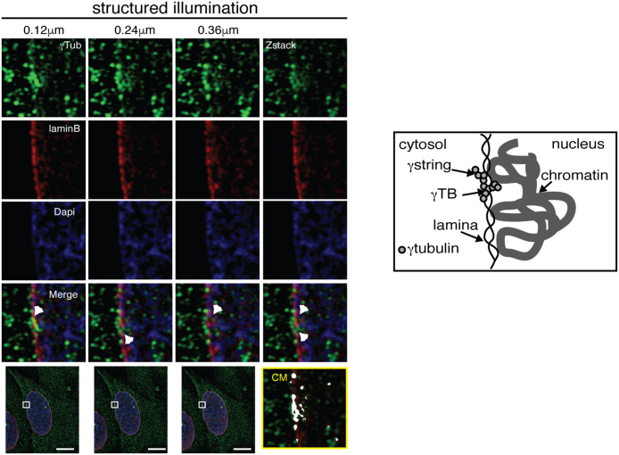 Fig. 8. γ-strings are intertwined with the lamina meshwork. Localization of endogenous γ-tubulin with an anti-γ-tubulin (T6557; green), lamina with an anti-lamin B (laminB; red) antibody and nuclei with DAPI (blue) were examined in U2OS cells in interphase. Structured illumination images are the mid planes of the nuclear compartment of a U2OS cell. Z-stack images were collected at 0.12 μm intervals. Z-stack shows average intensity projection of the displayed three Z-stack images. The white box shows the magnified areas. Arrowheads show protein bridges of γ-tubulin. The yellow box shows colocalization pixel-map (CM) of the red and green channels. White areas in CM denote colocalized pixels between channels. The figure shows representative images from four experiments. Scale bars, 10 μm. Right panel, γ-tubulin forms strings (γstrings) that act as protein bridges (γTB) between the cytosolic and the nuclear compartment. In their way into the nucleus, a γ-string goes through the nuclear lamina. |
