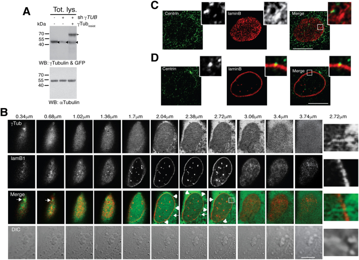 Fig. 9. γ-Tubulin forms a cellular meshwork. (A) Total lysate from U2OS, U2OS cells stably expressing γTUBULIN shRNA (shγTUB) and U2OS cells stably expressing γTUBULIN shRNA and GFP-γ-tubulinresist (γTubresist, n = 3) were analyzed by WB for the expression of endogenous γ-tubulin (arrowhead) and GFP-γ-tubulinresist (arrow) with a mixture of an anti-γ-tubulin (T6557) and an anti-GFP (sc-8334) antibody. An α-tubulin loading control is shown. (B) Differential interference contrast (DIC)/fluorescence images of a Z-stack of U2OS cells stably expressing γTUBULIN shRNA and GFP-γ-tubulinresist (γ-TubGFP; green) and transiently expressing mCherry-tagged lamin B (red). Images were collected at 0.34 μm intervals. Z-stack images taken in the intervals 0.34â1.36 μm and 3.06â3.74 μm show the lower and the higher γ-string meshwork formed on the nuclear envelope, respectively. Z-stack images in the interval 1.7â2.72 μm show the γ-string meshwork in the nuclear compartment. Arrows and arrowheads show the centrosomes and γ-tubulin bridges, respectively. The magnified area (white border) shows a γ-tubulin bridge (right panels). The figure shows representative images from at least eight experiments. (C, D) Localization of endogenous centrin with an anti-centrin (green) and lamina with an anti-lamin B (laminB; red) antibody were examined in U2OS cells in interphase. Confocal images are the mid planes of the nuclear membrane (C) or of the nuclear compartment (D) of U2OS cells. (B-D) Scale bars, 10 μm. |