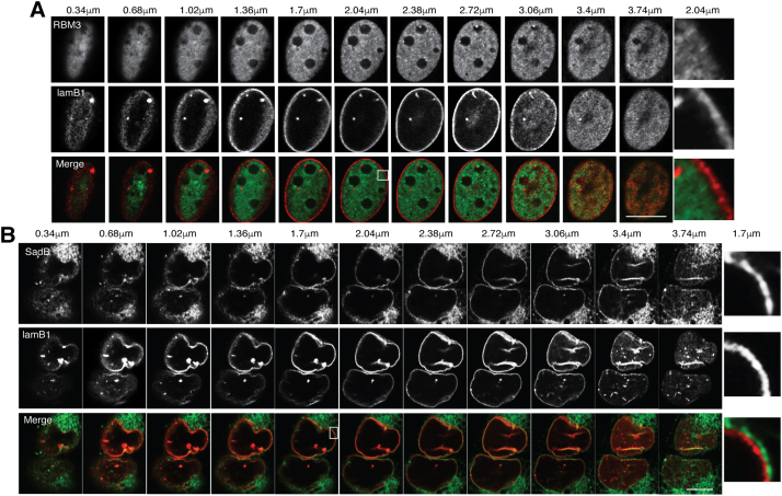 Fig. 10. Neither RBM3 nor SadBL form a cellular meshwork. (A, B) Confocal images of a Z-stack of U2OS cells transiently expressing either GFP-RBM3 (RBM3; A) or GFP-SadBL (SadB; B), and transiently expressing mCherry-tagged lamin B (laminB1). Images were collected at 0.34 μm intervals. (A) Z-stack images taken in the intervals 0.34–0.68 μm and 2.72–3.74 μm show the nuclear envelope and in the interval 1.02–2.38 μm shows the nuclear compartment of cells expressing RBM3. (B) Z-stack images taken in the intervals 0.34–0.68 μm and 3.06–3.74 μm show the nuclear envelope and in the interval 1.02–2.72 μm shows the nuclear compartment of cells expressing SADB. (A, B) The magnified area (white border) shows the mid plane of the nuclear compartment (right panels). Scale bars, 10 μm. |