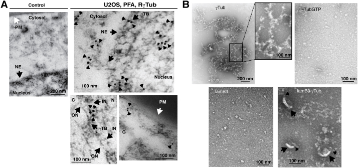 Fig. 12. The γ-tubulin meshwork supports formation of lamin B3 protofilaments. (A) Endogenous γ-tubulin detection in immunoelectron microscopy using an anti-γ-tubulin antibody or no primary antibody (control) on paraformaldehyde fixed (PFA) U2OS cells. Images show the plasma membrane [PM], cytosol [C], nuclear envelope [NE], inner [IN] and outer [ON] nuclear membranes and nucleus [N] and γ-tubulin bridges [γTB] of a U2OS cell. A black box shows the magnified area displayed in the inset. Black arrowheads show either immunolabeled γ-strings (RγTub) or immunolabeled microtubules (RαTub). Arrows show the indicated structure (n = 3). (B) Purified γ-tubulin and lamin B3 (lamB3) were negatively stained and imaged by electron microscopy in the absence (γ-Tub) or presence of 1 mM GTP (γ-TubGTP). The magnified area (black border) shows γ-strings and arrows and arrowheads show lamin B3 fibers and γ-strings, respectively. |