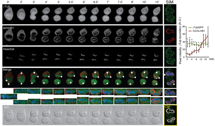 Fig. 14. Lamin B1 assembles at the γ-tubulin boundary. The DIC/fluorescence images show time-lapse series from a stable γTUBULINsh-U2OS cell co-expressing GFP-γ-tubulinresist (γTub; green) that was transiently expressing mCherry-lamin B1 (lamB1; red). The image series show chosen frames of the lamina (laminB1) formation at the γ-string boundary (cytosolic and chromatin-associated γ-strings) formed by GFP-γ-tubulinresist during nuclear assembly in a mitotic cell. The mitotic chromosomes/daughter nuclei are magnified below the merged images. Arrowheads and arrows show the γ-string-boundary around the mitotic chromosomes and the mitotic spindle, respectively. The graph shows the time-dependent changes in fluorescence intensity across the white box at the γ-string-boundary of γtubGFP (green) and mCherry-lamin B1 (mChlmB1; red) expressed in arbitrary units (AU; mean ± s.d.; n = 3). Right, structured illumination microscope (SIM) images show immunofluorescence staining of endogenous γ-tubulin and lamin B with an anti-γ-tubulin (green; T6557) and anti-lamin B1 (red) antibody of newly formed U2OS daughter cells. Nuclei were detected with DAPI (blue). The yellow box shows colocalization pixel-map (CM) of the red and green channels. White areas in CM denote colocalized pixels between channels. Scale bars, 10 μm. See also movie S1. |