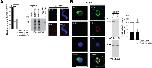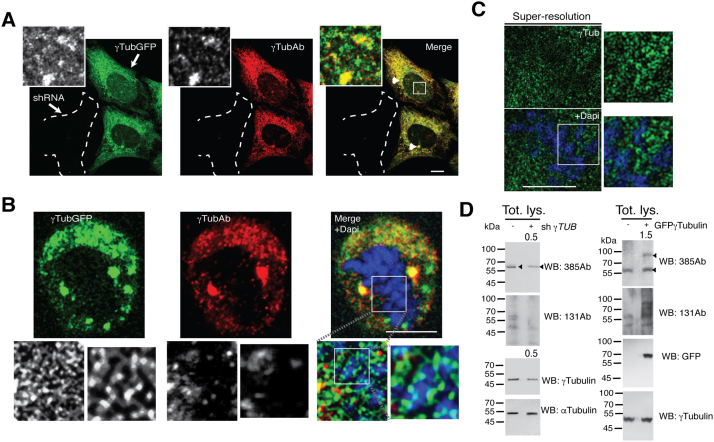 Fig. 17. Anti-γ-tubulin antibodies partially recognize chromatin-associated γ-strings. (A, B) The fluorescence images show representative images of immunostained GFP-γ-tubulin (green; γTubGFP) with an anti-γ-tubulin antibody (red; γTubAb; T3320) in interphase (A) and mitotic (B) U2OS cells stably expressing both γTUBULIN shRNA (shRNA) and GFP-γ-tubulinresist (γTubGFP). Four different antibodies were tested (ab27074, T5192, T3320 and T6557) and the one that best recognized chromatin-associated γ-tubulin (T3320) is shown. (A) The specificity of the polyclonal anti-γ-tubulin antibody (T3320) used was tested in U2OS cells stably expressing both γTUBULIN shRNA and GFP-γ-tubulinresist (γTUBULINsh-U2OS-GFP-γ-tubulinresist cells). The dashed line follows one of three γTUBULINsh-U2OS-GFP-γ-tubulinresist cells with low expression of both endogenous γ-tubulin and GFP-γ-tubulinresist. Arrows and arrowheads indicate a cell with high and low expression of γ-tubulin and the location of centrosomes, respectively. (C) Structured illumination images of a fixed U2OS immunostained with an anti-γ-tubulin (T6557). (A-C) White borders show the magnified areas displayed in the insets. Scale bars, 10 μm. (B, C) Nuclei were detected with DAPI (blue). (D) Total lysate from U2OS and U2OS cells stably expressing γTUBULIN shRNA (shγTUB) or NGFP-γ-tubulin were first analyzed by WB with a polyclonal anti-γ-tubulin antibody (385Ab) and reprobed with a polyclonal anti-γ-tubulin antibody (131Ab), a mixture of two anti-γ-tubulin (T5192 and T3320) or of two anti-GFP antibodies (sc-53882 and sc-8334) and an anti-α-tubulin antibody. Arrowheads indicate the 60-kDa and the 90-kDa bands recognized by 385Ab (n = 3). Numbers on WBs indicate the level of depletion or enrichment of the amount or proteins recognized by the indicated antibody relative to control. To adjust for differences in protein loading, the protein concentration of the indicated proteins was determined by its ratio with endogenous γ-tubulin for each sample. The protein ratio in control extracts was set to 1. |