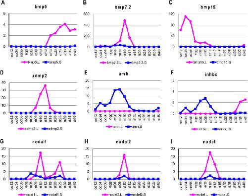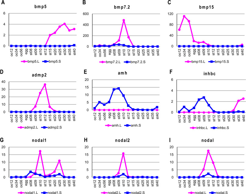Fig. 2. Differential expression of nine TGF-β ligands (AâI). The y axis shows the TPM value from RNA-seq analysis. Gene expression of the L and S homeologs is indicated by the red and blue lines, respectively. oo12, oo34, and oo56 indicate oocyte stages 1/2, 3/4, and 5/6, respectively. The embryonic stages of Nieuwkoop and Faber (1967) are also indicated. |