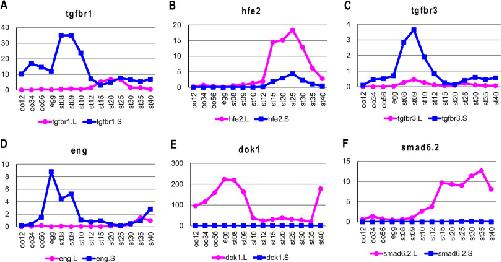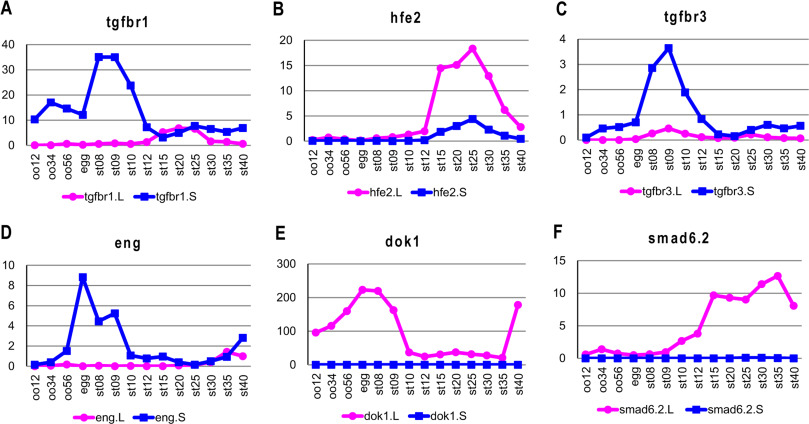 Fig. 5. Differential expression of six receptors, co-receptors and receptor-associated intracellular factors in the TGF-β pathway (AâF). The y axis shows the TPM value from RNA-seq analysis. Gene expression of the L and S homeologs is indicated by the red and blue lines, respectively. oo12, oo34, and oo56 indicate oocyte stages 1/2, 3/4, and 5/6, respectively. The embryonic stages of Nieuwkoop and Faber (1967) are also indicated. |