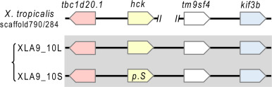 Fig. 8. Genomic structure of the hck loci. On the S chromosome, hck.S is largely deleted and becoming a pseudogene. In X. tropicalis, this locus is broken into scaffold790 containing hck gene and scaffold284. |