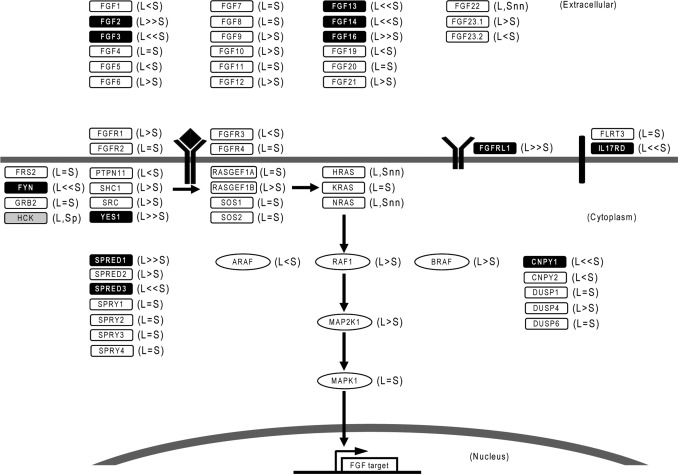 Fig. 6. Overview of genomic structure and gene expression in the FGF pathway. L and S indicate homeologs on the L and S chromosomes, respectively. The suffixes e, p, and d following L or S indicate “expansion”, “pseudogene”, and “deletion”, respectively. In cases where the genomic sequence was not available due to the absence of a scaffold or a large N gap, the L and S homeologs are indicated by the suffixes “ns (no scaffold)” or “nn (no model due to N)”. Inequality signs indicate the relative expression between a homeologous pair of genes. Differentially expressed genes and singletons are shown as black and grey boxes, respectively. |