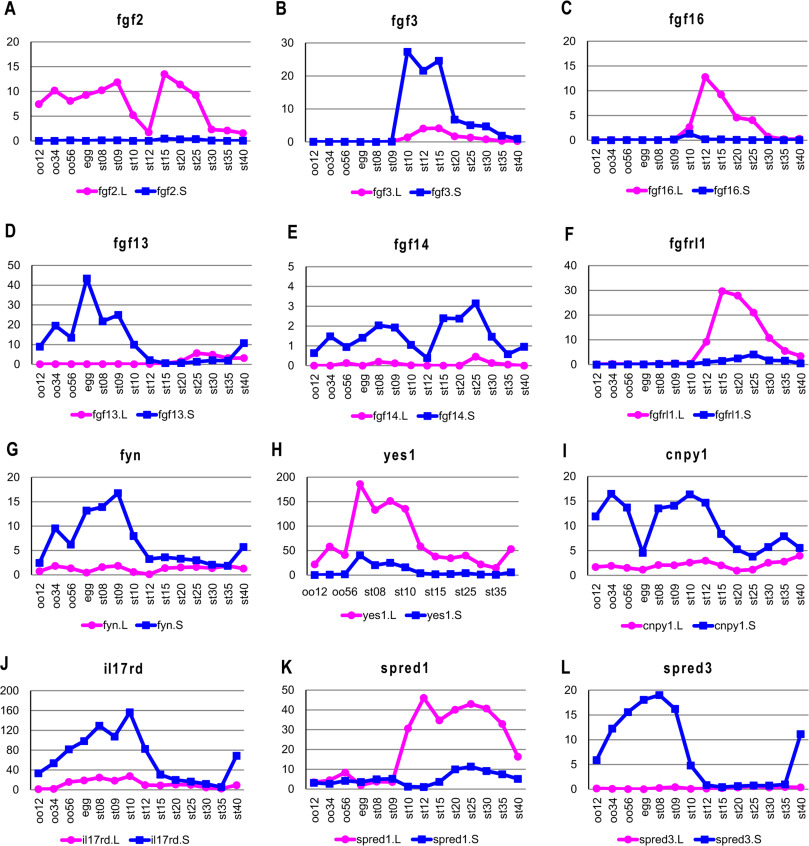 Fig. 7. Differential expression of twelve FGF ligands, receptors, and components of the RasâMAPK pathway (A-L). The y axis shows the TPM value from RNA-seq analysis. Gene expression of the L and S homeologs is indicated by the red and blue lines, respectively. oo12, oo34, and oo56 indicate oocyte stages 1/2, 3/4, and 5/6, respectively. The embryonic stages of Nieuwkoop and Faber (1967) are also indicated. |