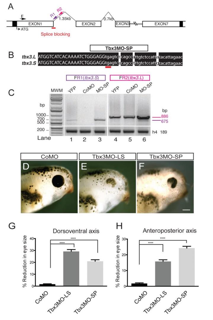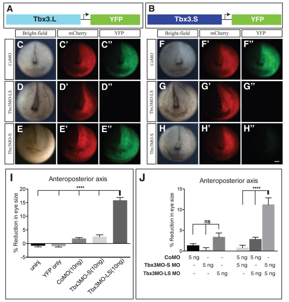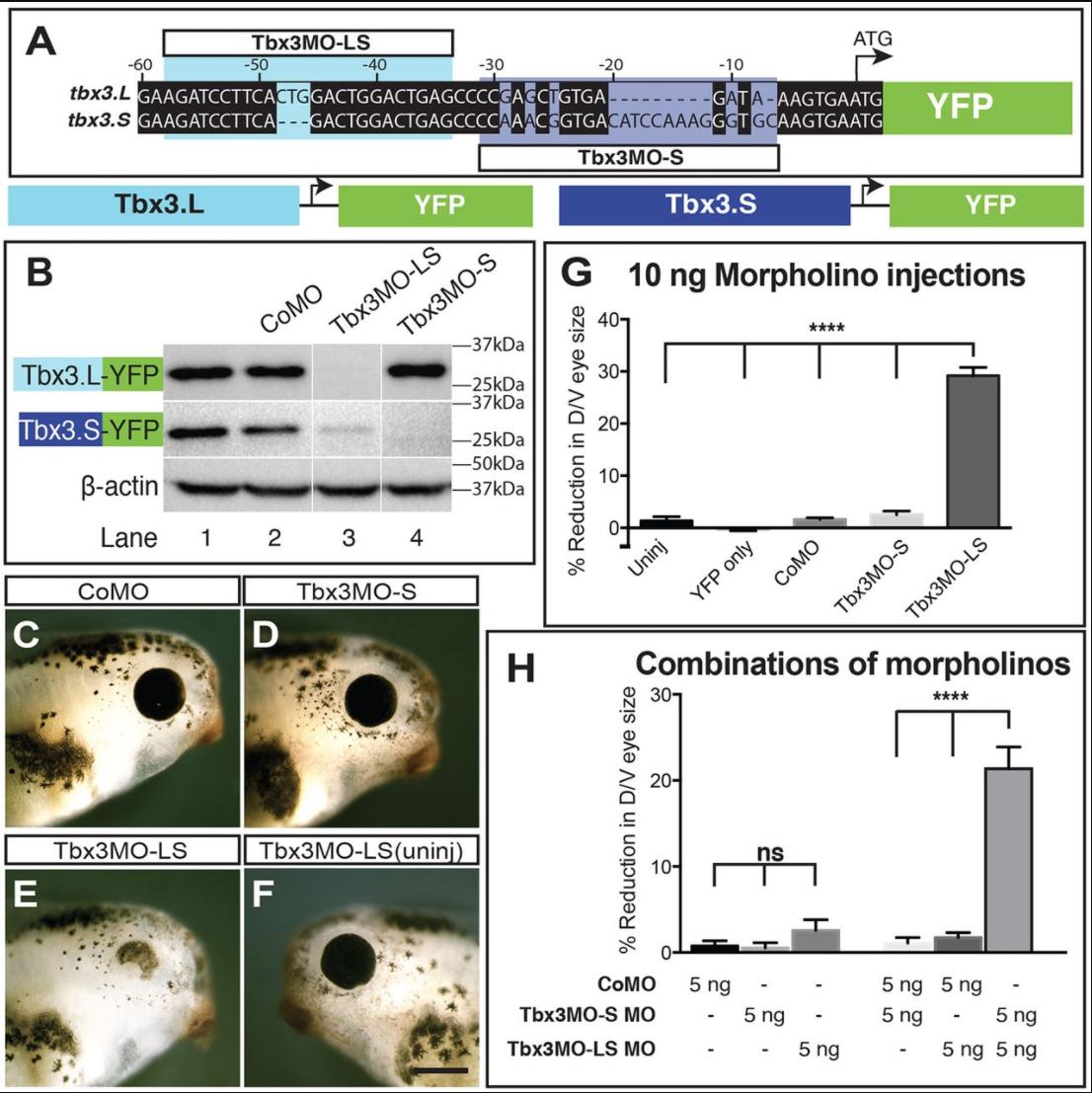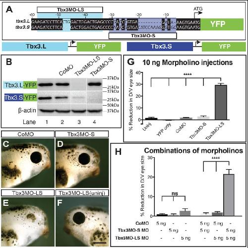 Fig. 2. Tbx3 is required for normal eye formation. Design and test of Tbx3 morpholino activity. (A) Comparison of X. laevis tbx3.L and tbx3.S homeologs showing the position of morpholino target sequences. (B) Western blots were used to detect the expression of YFP and β-actin (loading control) in extracts prepared from embryos injected at the 2-cell stage (both blastomeres) with 10â ng of the indicated morpholino and Tbx3.L/.S-YFP RNA. (C-E) Injected side of tadpoles treated with 10â ng CoMO (C), Tbx3MO-S (D) or Tbx3MO-LS (E). (F) Uninjected side of tadpole in E. (G,H) The percentage reduction in eye size was determined by comparing the dorsoventral (D/V) eye diameter on the uninjected and injected sides. Histograms show eye diameter reduction in tadpoles injected with YFP RNA and the indicated morpholino (G) or combination of morpholinos (H). N=2; nâ¥29; ****P<0.0001; ns, not significant. Scale bar: 200â μm. |