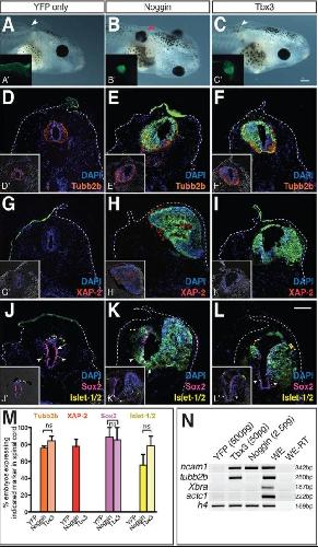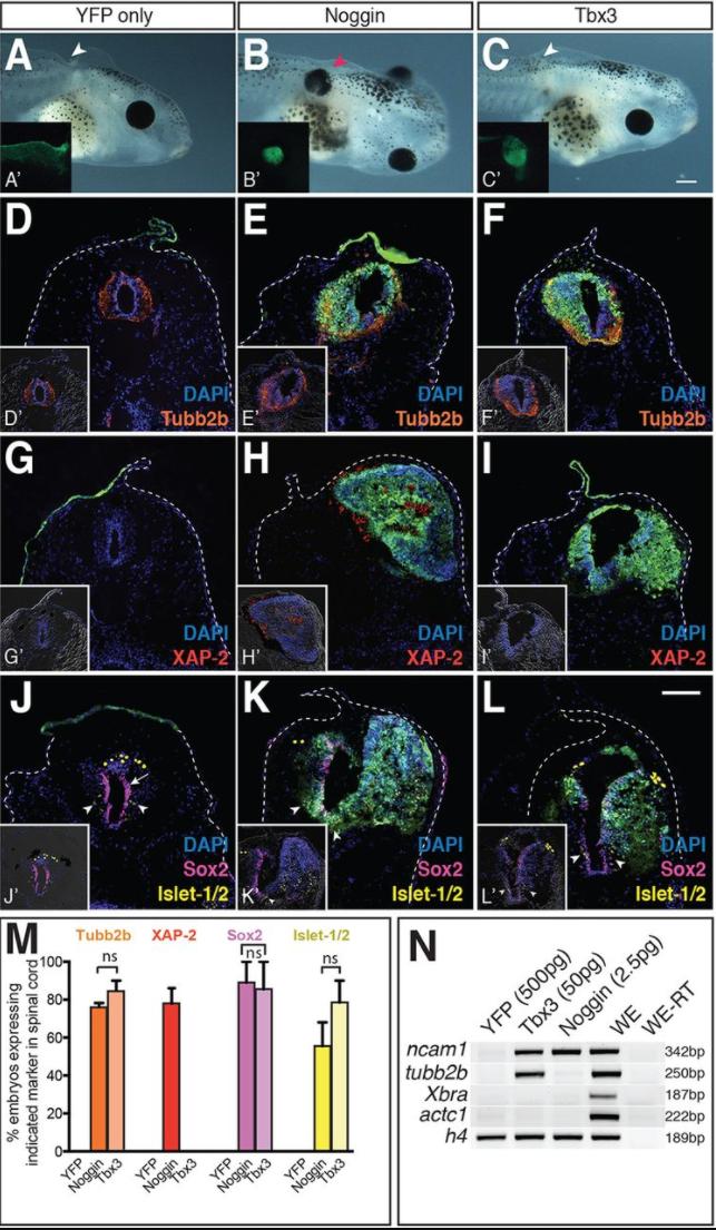 Fig. 5. Tbx3-expressing cells are specified to a spinal cord, not retinal fate when transplanted to the posterior neural plate. (A-L) Ectodermal explants expressing the indicated RNAs were transplanted to the posterior neural plate of stage 15 embryos and grown to tadpoles (ACTâPNP). Arrowheads (A-C) indicate location of YFP donor tissue. (D-L) Donor cells expressing YFP alone (D,G,J) or with Noggin (E,H,K) or Tbx3 (F,I,L). Sections were stained to detect neural (Tubb2b, orange, D-F), retinal (XAP-2, red, G-I) and spinal cord (Sox2, magenta, ventricular zone; Islet-1/2, yellow, Rohon-Beard and motor neuron, J-L) cells. DAPI (blue) and YFP (green) label nuclei and donor cells, respectively. To better visualize cell fate markers, Dâ²-Lâ² insets show D-L without YFP channel. (M) Histogram showing the percentage of host embryos expressing the indicated markers in mosaic spinal cords. (N) Ectodermal explants isolated from stage 9 embryos injected bilaterally at the 2-cell stage with the indicated RNA were cultured in vitro to stage 21. RT-PCR was used to detect ncam1, tubb2b, t (xbra), actc1 and histone H4 (h4: loading control). Whole embryos processed with (WE) and without (WE-RT) reverse transcriptase served as positive and negative controls, respectively, N=2; nâ¥32; ns, not significant. Scale bars: 400â μm (C), 100â μm (L). |