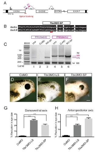 Fig. S3. Splice blocking phenocopies eye defects observed with translation blocking Tbx3 morpholinos. The splice blocking morpholino (Tbx3MO-SP) was designed to the exon 1 splicedonor site of tbx3.L and tbx3.S. An in frame stop codon is located in intron 1 Development ⢠Supplementary information Development 143: doi:10.1242/dev.130955: Supplementary information immediately following the splice-donor site, resulting in truncation of the protein. (A) Schematic of Tbx3 gene structure, location of the splice blocking morpholino, and PCR primers used to confirm altered splicing. (B) Alignment of tbx3.L and tbx3.S target sites with location of Tbx3MO-SP. Uppercase and lowercase nucleotides identify exon and intron regions, respectively. In frame intronic stop codon (tga) is underlined in red. (C) RT-PCR to detect unspliced tbx3.S (FR1) and tbx3.L (FR2) transcripts. An increase in unspliced tbx3.S and tbx3.L transcripts is detected in Tbx3MO-SP (MO-SP) injected embryos relative to YFP and control (CoMO) morpholino injected embryos. (D-F) Eye defects following splice-blocking of Tbx3 transcript. Injected side of tadpoles treated with Tbx3MO-SP (F, n=87) is shown with the CoMO (D) and Tbx3MO-LS (E) injected tadpoles from Fig. 2 for comparison purposes. (G-H) The percent reduction in eye size was determined by comparing the dorsoventral and anteroposterior diameters of the eye on the injected side relative to the uninjected side. Histograms show eye size differential measured in tadpoles injected in one blastomere at the eight-cell stage with the indicated morpholino. Histograms show mean±s.e.m; N=2; ****Pâ¤0.0001; scale bars, 200 μm. |