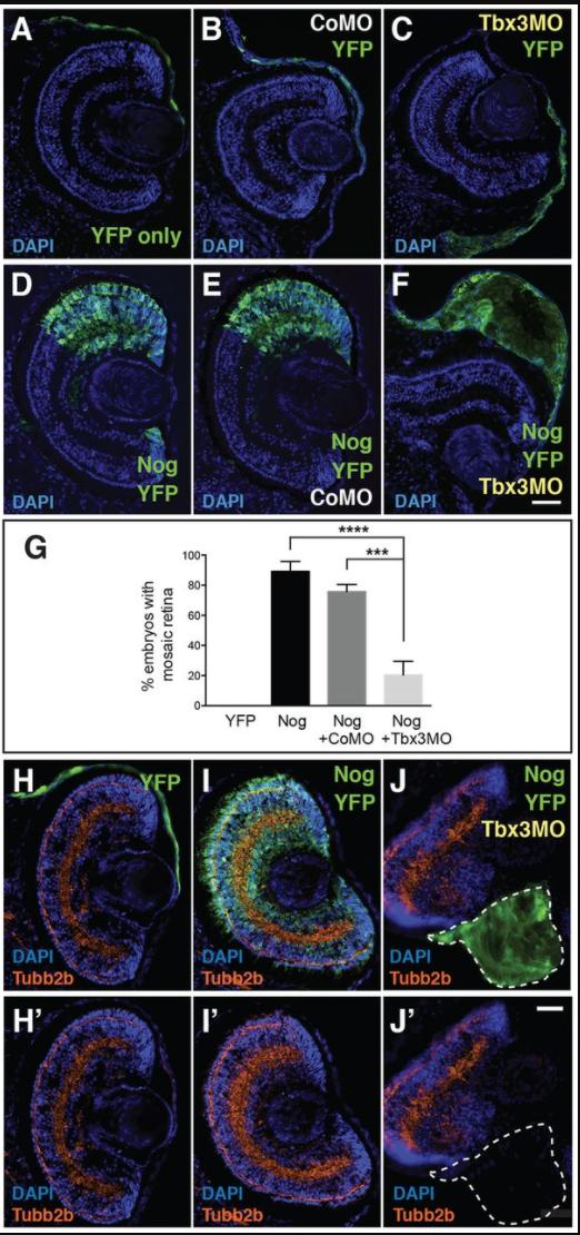 Fig. 3. Tbx3 knockdown inhibits the retinal- and neural-inducing activity of Noggin. (A-F) Retinal sections of tadpoles that received grafts at stage 15 (ACTâEF). (A-C) Donor cells expressed (A) YFP only, or were co-injected with (B) CoMO or (C) Tbx3MO-LS (Tbx3MO). (D-F) Donor cells expressed (D) YFP plus Noggin (Nog) alone, or in combination with (E) CoMO or (F) Tbx3MO. (G) Histogram showing the average percentage of tadpoles in which donor cells formed retina. (H-Jâ²) Retinas of tadpoles receiving donor cells expressing (H,Hâ²) YFP alone, or in combination with (I,Iâ²) Noggin or (J,Jâ²) Noggin with Tbx3MO. Staining marks nuclei (DAPI; blue), donor-derived cells (YFP; green) and neural tissue (Tubb2b; red). Dashed line in J and Jâ² indicates location of donor cells. Dorsal side up. N=3; nâ¥40; ***P<0.001, ****P<0.0001. Scale bar: 50â μm. |