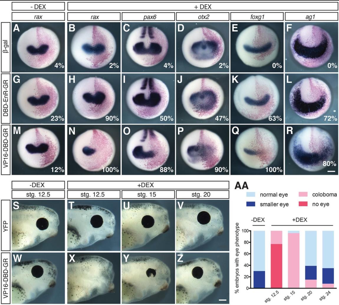 Fig. 7. Tbx3 repressor activity is required at eye field stages for normal neural patterning and eye formation. (A-R) In situ hybridization was used to detect changes in rax, pax6, otx2, foxg1 and ag1 transcript levels at stage 15. Eight-cell embryos were injected in one blastomere with β-gal alone (150â pg, A-F), and in combination with DBD-EnR-GR (12.5âpg, G-K; 50â pg, L) or VP16-DBD-GR (5â pg, M-R) RNA. At stage 12.5, embryos were untreated (A,G,M) or treated with dexamethasone (B-F, H-L and N-R). The percentage showing a change in expression is indicated, N=2; nâ¥41. (S-Z) The repressor activity of Tbx3 is required at eye field stages for normal eye formation. Control (S-V)- and VP16-DBD-GR (W-Z)-injected embryos were untreated (S,W) or treated with dexamethasone starting at the indicated stage. (AA) Histogram shows the percentage of tadpoles with the indicated eye defects, N=2; nâ¥35. Scale bars: 300â μm (R), 400â μm (Z). |
