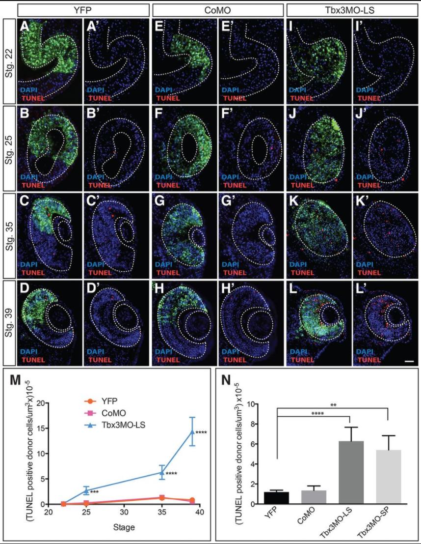 Fig. 8. Tbx3 knockdown results in retinal progenitor apoptosis and eye defects. Eye field cells isolated from embryos expressing YFP (A-Dâ²), CoMO (E-Hâ²) or Tbx3MO-LS (I-Lâ²) were grafted into the eye field of untreated embryos (EFâEF). TUNEL staining was used to detect cell death of the transplanted (YFP-positive) cells at stage 22 (A,Aâ²,E,Eâ²,I,Iâ²), 25 (B,Bâ²,F,Fâ²,J,Jâ²), 35 (C,Câ²,G,Gâ²,K,Kâ²), and 39 (D,Dâ²,H,Hâ²,L,Lâ²). Dotted lines indicate the outline of the optic vesicle (stgs 22 and 25), optic cup and lens (stgs 35 and 39). (M) Line graph indicates the number of TUNEL-positive donor (YFP-positive) cells per unit volume of transplanted cells as a function of developmental stage. (N) Number of TUNEL/YFP double-positive cells per unit volume that were detected in the stage 35 retina of tadpoles that received eye field transplants from embryos injected with YFP only, CoMO, Tbx3MO-LS and Tbx3MO-SP at stage 15. Dorsal retina is the top of each panel. Graphs show mean±s.e.m.; N=3, nâ¥9; **Pâ¤0.01, ***Pâ¤0.001, ****Pâ¤0.0001. Scale bar: 50â μm. |