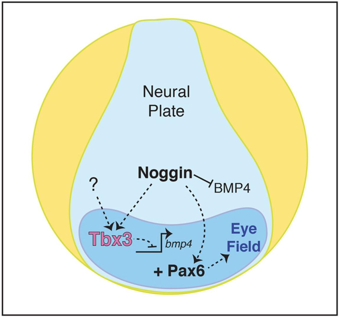 Tbx3 represses bmp4 expression and, with Pax6, is required and sufficient for retina formation.
