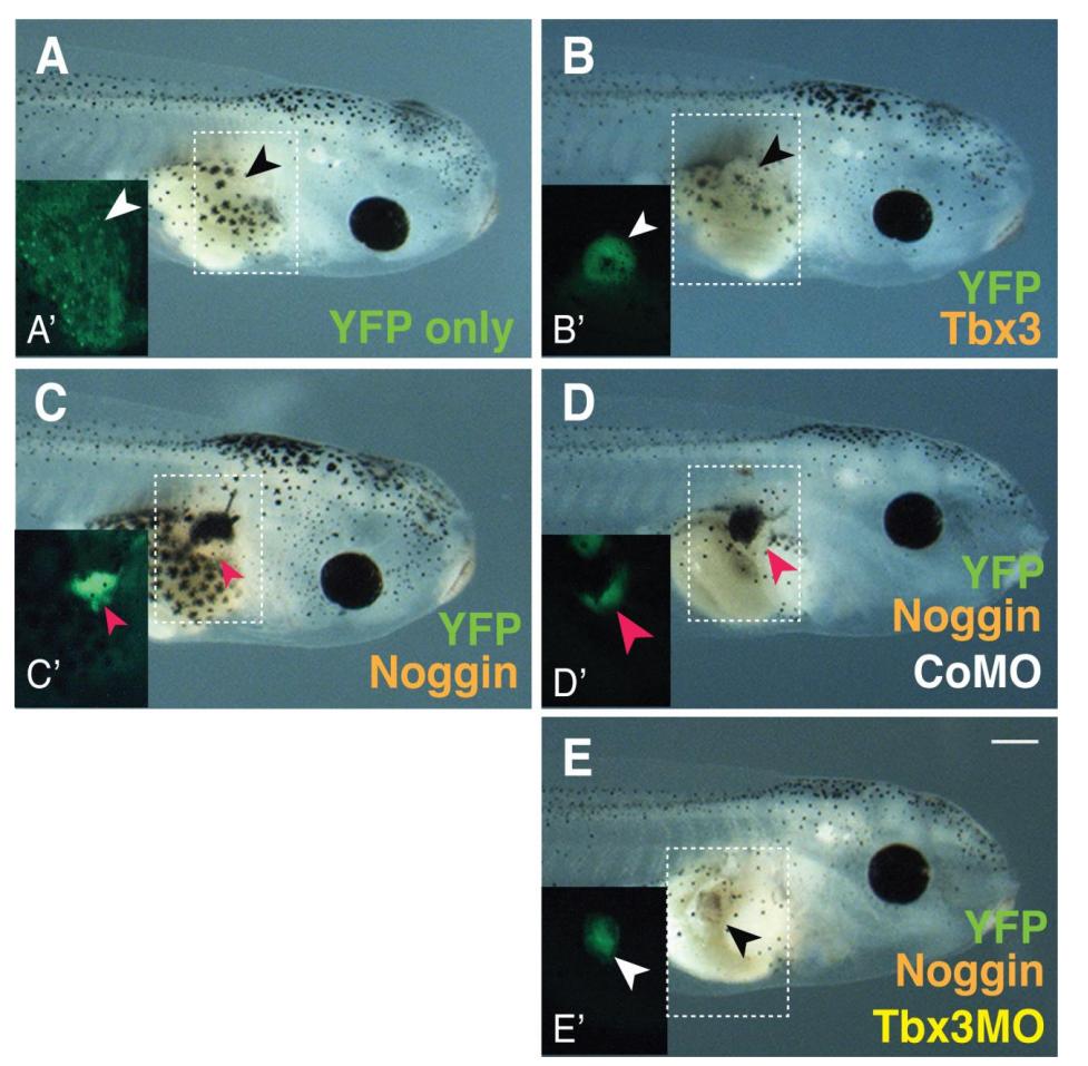 Fig. S4. Magnified view of Fig. 4 Panels A-Eâ. (A-Eâ) Animal cap cells isolated from embryos injected with the indicated RNAs and morpholinos were transplanted to the flank of stage 15 embryos, which were then grown to tadpole stages (ACTâFlank). Arrowheads (A-E) indicate location of YFP positive (Aâ-Eâ) transplant on the flank of tadpoles. Scale bar, 400 μm. |