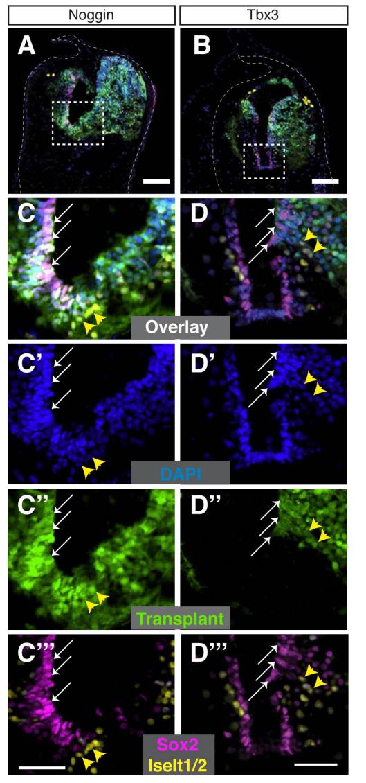 Fig. S6. Magnified view of Noggin and Tbx3-treated transplanted cells expressing Sox2 or Islet1/2. (A-B) Panels from Fig. 5K,L with a dashed white box showing the area of magnification. Each column of images were taken from the same sample. Ectodermal explants were isolated from embryos injected with YFP and Noggin (A) or YFP and Tbx3 RNA-injected embryos (B), transplanted to the posterior neural plate at stage 15 and the resulting tadpoles were sectioned and stained at stage 43 (ACTâPNP). (C-Dâââ) Enlarged images of panel A and B shows Sox2 (white arrows) or Islet1/2 (yellow arrowheads) positive cells co-expressing YFP. |