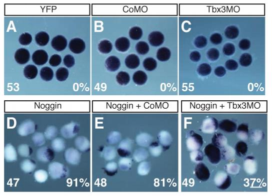 Fig. S7. Tbx3 is necessary for the ability of Noggin to repress bmp4 expression in ectodermal explants. (A-F) In situ hybridization was used to detect changes in bmp4 expression in ectodermal explants. Ectodermal explants were isolated from embryos injected bilaterally with RNA at the 2-cell stage of the indicated construct and/or morpholino. In situ hybridization for bmp4 expression performed at the equivalent of stage 22. Embryos injected with 500 pg YFP, 2.5 pg Noggin, 20 ng morpholinos (per blastomere); N=3, nâ¥47. Scale bar, 200 μm. |