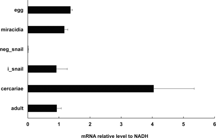 Figure 4. Expression profiles of SjAQP in different stages of the parasite life cycle.Reverse transcription-quantitative polymerase chain reaction revealed the expression of SjAQP in S. japonicum developmental-specific stages – eggs, miracidia, cercariae, and adults. cDNA levels were normalized using the NADH housekeeping gene as an internal control. neg_snail, naive snails as the negative control; i_snail, S. japonicum infected snails.
