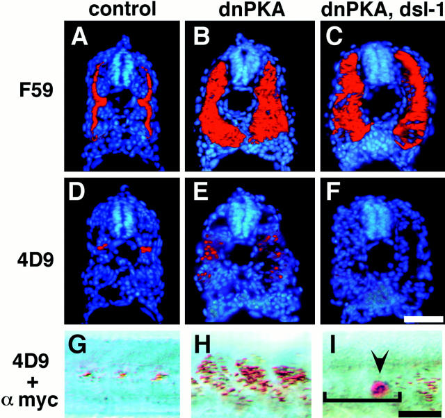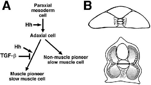 We have examined whether the development of embryonic muscle fiber type is regulated by competing influences between Hedgehog and TGF-beta signals, as previously shown for development of neuronal cell identity in the neural tube. We found that ectopic expression of Hedgehogs or inhibition of protein kinase A in zebrafish embryos induces slow muscle precursors throughout the somite but muscle pioneer cells only in the middle of the somite. Ectopic expression in the notochord of Dorsalin-1, a member of the TGF-beta superfamily, inhibits the formation of muscle pioneer cells, demonstrating that TGF-beta signals can antagonize the induction of muscle pioneer cells by Hedgehog. We propose that a Hedgehog signal first induces the formation of slow muscle precursor cells, and subsequent Hedgehog and TGF-beta signals exert competing positive and negative influences on the development of muscle pioneer cells.