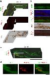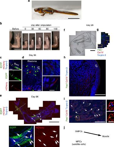 Figure 3. SMFC tracking in metamorphosed newt limb regeneration.(a) Juvenile (16 months old). Scale bar, 15 mm. (b) Limb regeneration. Scale bar, 5 mm. (c–e) Tracking of SMFCs (mCherry+) (n=2). This animal was a mosaic expressing EGFP in muscle only. mCherry+ fibres in the forearm were ∼25% of total EGFP+ fibres. (c) On day 36 after amputation, fragments of muscle fibres (arrows) were observed in distal regions adjacent to the blastema. Scale bar, 100 μm. (d) mCherry+ mononucleated cells (red arrowheads; enlarged in right-hand panels) and EGFP+ cells (green arrowheads) were observed in the blastema. Epi, epidermis. To-pro-3: nuclei. Scale bars, 50 μm (left), 10 μm (right-hand panels). (e) In the same limb, at day 96 after the second amputation in the upper arm (line), mCherry (arrows) and EGFP were observed only in muscle fibres. Scale bars, 1 mm (upper panel), 500 μm (lower panels). (f–i) Pax7 immunolabelling of a regenerating limb on day 26 after amputation (n=4). Pax7 immunoreactivity was not detected in the blastema. (f) Translucent image. Line: amputation site. (g) Merged fluorescence image. Col IV, collagen type IV immunoreactivity. To-pro-3: nuclei. Scale bar, 1 mm. (h) Enlargement of a region in the blastema and (i) a region proximal to the amputation site, enclosed by boxes in g. Scale bars, 250 μm. Arrowheads in (i) Pax7+ nuclei. An example satellite cell (box) is enlarged in the right-hand panels (upper: Col VI/To-pro-3; lower: Col IV/Pax7). Scale bar, 50 μm. (j) Summary. In metamorphosed newts, SMFCs were recruited for new muscle during limb regeneration, whereas MPCs such as satellite cells were not. |