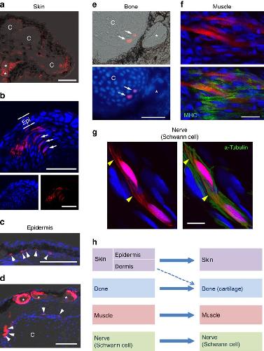 Figure 4. Lineage tracing in adult newt limb regeneration by tissue transplantation.(a,b) Tracing of skin cells by allograft of mCherry+ skin (n=3). (a) mCherry+ cells were distributed along the epidermis and dermis, as well as around the cartilage in a regenerating part of the limb (day 40). c, cartilage. Asterisk, mucous gland. Scale bar, 200 μm. (b) In a growing tip of new digit, mCherry was sometimes observed in chondrocytes (arrows) in the cartilage and in interstitial cells surrounding the cartilage. Epi: epidermis. Scale bars, 100 μm. (c,d) Tracing of epidermal cells by transplantation of mCherry+ ectoderm at embryonic stage (n=2). mCherry was observed in epidermal cells such as those in multilayered epithelium (arrowheads in c) and mucous glands (asterisks in d), as well as in interstitial cells around the cartilage (arrowheads in d) in a regenerating part of the limb (day 148). Scale bars, 200 μm. (e) Tracing of bone cells by allograft of mCherry+ bone (n=4). mCherry was observed in chondrocytes (arrows) in new cartilage of a regenerating limb (day 81). Asterisk: mucous gland. Scale bar, 100 μm. (f) Tracing of muscle cells by allograft of mCherry+ muscle (n=3). mCherry was observed in muscle fibres in a regenerating part of the limb (day 81). MHC, myosin heavy chain immunoreactivity. Scale bar, 50 μm. (g) Tracing of Schwann cells by implantation of a fragment of mCherry+ nerve (n=3). mCherry was observed in Schwann cells along regenerated nerve fibres in a regenerating part of the limb (day 133). Arrowhead: myelin sheath covering a regenerated nerve fibre; a-tubulin, acetylated tubulin immunoreactivity. Scale bar, 20 μm. Blue: nuclei stained by To-pro-3 (b–d,f,g) and DAPI (4,6-diamidino-2-phenylindole) (e). (h) Summary. The skin, bone, muscle and nerve (Schwann cell) regenerated themselves. Exceptionally, dermis contributed to new bone/cartilage. |