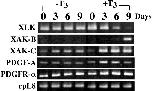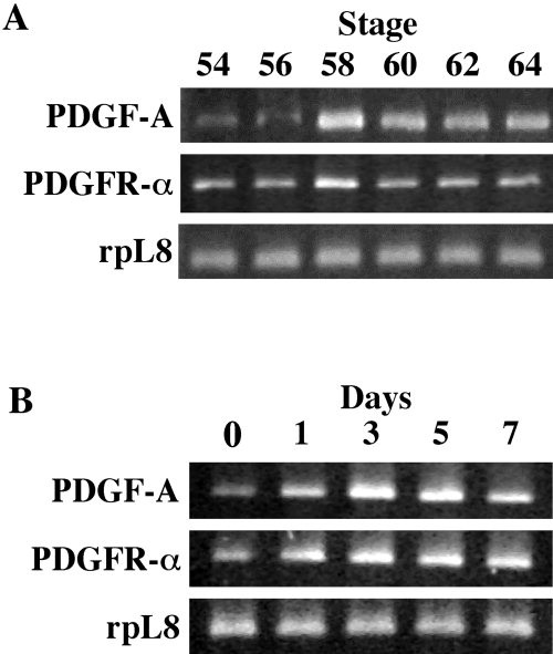 The anuran remodels the larval skin into the adult counterpart during metamorphosis. The construction of the precursor of adult epidermis (preadult epidermis) in Xenopus laevis larvae was coordinated with the development of the secondary connective tissue (s-ct) underneath the basement membrane, suggesting that the epithelial-mesenchymal interaction plays a critical role in the metamorphic conversion of the larval skin. mRNAs of platelet-derived growth factor A (PDGF-A) and PDGF receptor (PDGFR) -alpha were markedly up-regulated in the skin during spontaneous and thyroid hormone (TH) -induced metamorphosis. In situ hybridization experiments identified preadult epidermal basal cells and fibroblasts in developing subepidermal connective tissues at the late prometamorphic stage as PDGF-A and PDGFR-alpha mRNA-expressing cells, respectively. We developed an in vitro model of larval skin that was remodeled to the adult skin under the influence of TH. The presence of either of AG1296, a specific inhibitor of PDGFR tyrosine kinase autophosphorylation, or an excess of recombinant proteins of the soluble extracellular domain of PDGFR-alpha inhibited the following TH-induced processes, the proliferation of adult basal cells, the terminal differentiation of adult basal cells, and the activation of subepidermal fibroblasts. However, the inhibitors did not inhibit the TH-induced proliferation of preadult basal cells. We concluded that PDGF/PDGFR signaling is one of the prime cues in the epithelial-mesenchymal interaction required for the metamorphic skin remodeling.