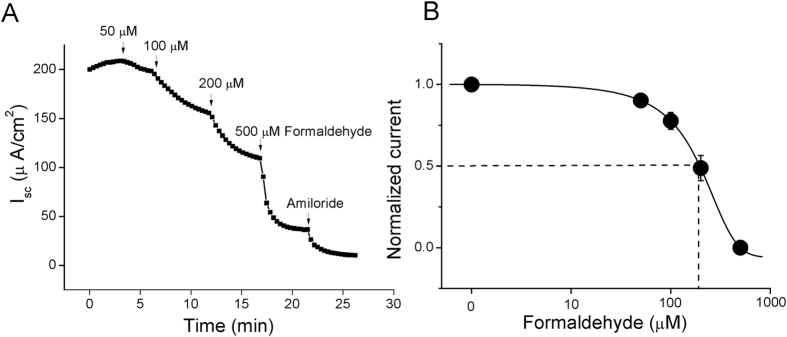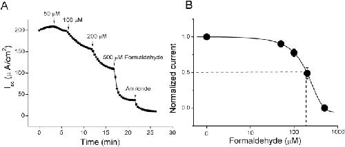 Figure 2. Formaldehyde reduces short-circuit current level in H441 monolayers in a dose-dependent manner.(A) Representative short-circuit current (Isc) trace showing applications of a series of concentrations of 50, 100, 200, and 500 μM formaldehyde. Amiloride-sensitive currents are defined as the difference between the total current and the amiloride-resistant current, with the basal amiloride-sensitive current set as 100%. (B) Normalized amiloride-sensitive currents at each concentration were plotted as a dose-response curve, N = 7. The raw data were calculated by fitting with the Boltzmann equation. The IC50 value was 165.6 μM.