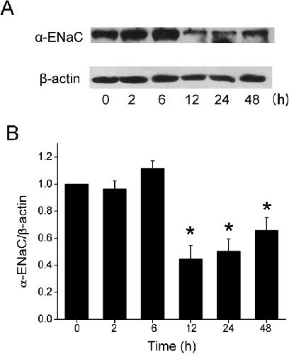 Figure 3. Effect of formaldehyde on α-ENaC protein level in H441 cells.(A) Representative western blot of α-ENaC protein extracted from H441 cells exposed to 200 μM formaldehyde for 0-48 h. Blots were immunostained with antibody to α-ENaC, or to β-actin as a loading control. (B) Graphical representation of data obtained from three sets of western blots and quantified using gray analysis (α-ENaC/β-actin). Data are shown as the mean ± SE, *P < 0.05, compared with control.