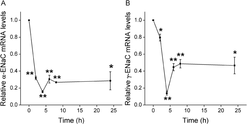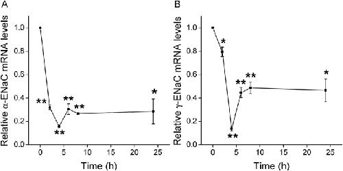 Figure 4. Effects of formaldehyde on transcriptional expression of ENaC α- and γ-subunits in H441 cells.mRNA samples were isolated from H441 cells treated with 200 μM formaldehyde for various periods. Relative levels of mRNA were calculated as α- or γ-ENaC/GAPDH ratios. (A) Real-time PCR results for α-ENaC mRNA. (B) Real-time PCR results for γ-ENaC mRNA. *P < 0.05, **P < 0.01, compared with control. N = 3.