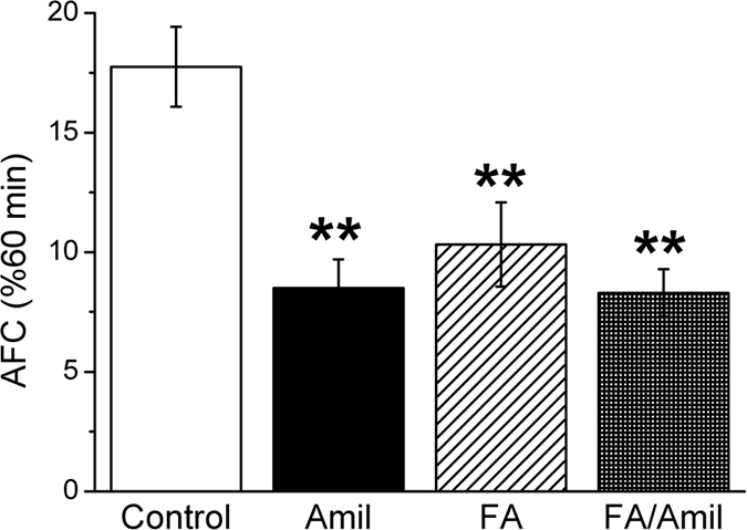 Figure 1. Downregulation of mouse alveolar fluid clearance in vivo by formaldehyde.Mouse lungs were instilled with 5% bovine serum albumin dissolved in physiologic saline solution in control group (Control), and in the presence of amiloride (Amil, 1 mM), formaldehyde (FA, 200 μM), and both (FA/Amil) for exposed mice. Reabsorption rate of instillate was computed as the percentage of instilled volume after 60 min (% 60 min). Average AFC values are presented as mean ± SE, One-way ANOVA. **P < 0.01, compared with control group. N = 6.