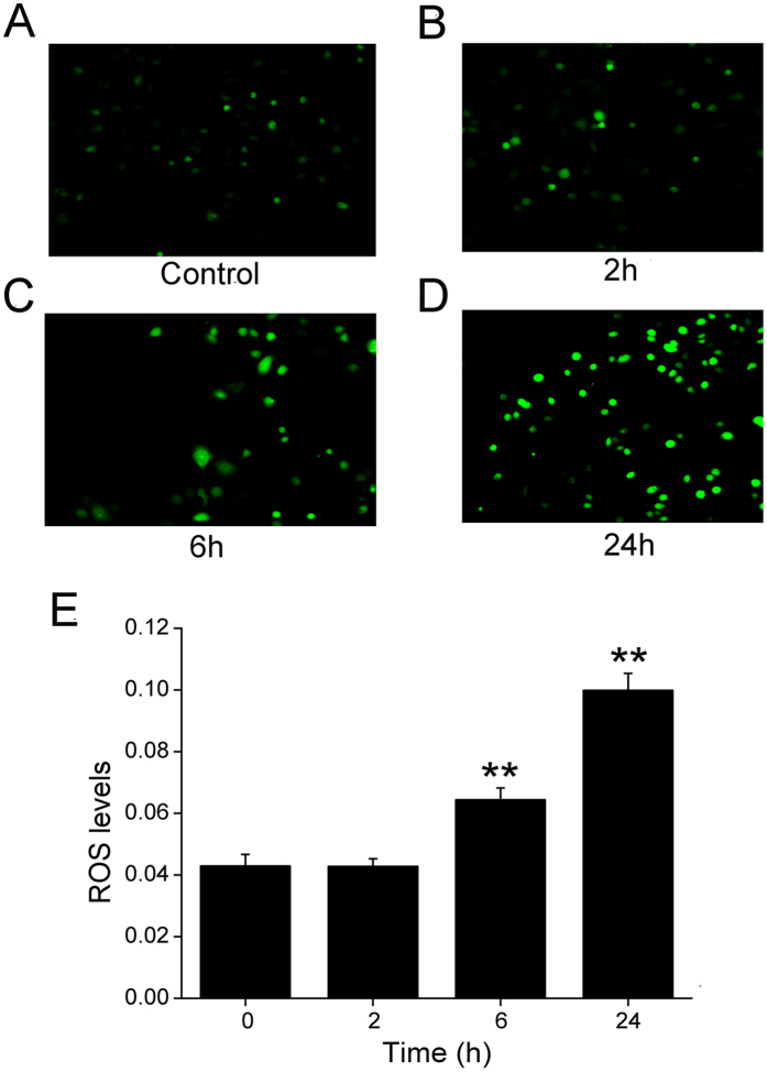 Figure 7. Effects of formaldehyde on oxidative stress in the H441 cells.Production of ROS was measured using the fluorogenic substrate 2′,7′-dichlorofluorescein diacetate, which is oxidized to fluorescent 2′,7′-dichlorofluorescein. (A) Air-subjected control cell culture. (B–D) Cells exposed to 200 μM formaldehyde for 2 h, 6 h, and 24 h. (E) The ROS levels displays the summary fluorescence intensity measured from the images of H441 cells (N = 25 in each group) treated with different periods of formaldehyde. Background fluorescence level was corrected. Data are shown as the mean ± SE, **P < 0.01, compared with control.