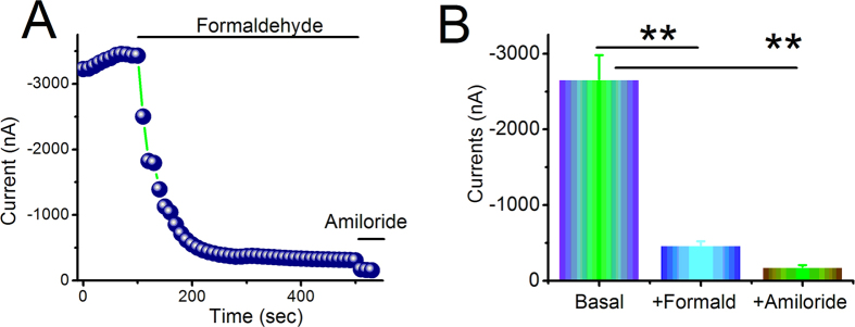 Figure 8. Formaldehyde alters the activity of heterologous human αβγ-ENaC channels expressed in oocytes.Oocytes were continuously perfused with formaldehyde and amiloride, and whole cell currents were monitored at 10-s intervals. (A) Representative inward current traces in the presence of formaldehyde and amiloride. Currents were digitized at −120 mV. Application of drugs is indicated by solid horizontal lines. (B) Average currents at −120 mV (mean ± SE). **P < 0.01 compared with basal level. N = 10 from 4 different frogs.
