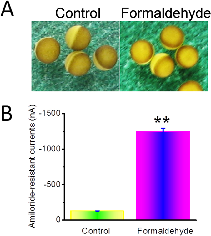 Figure 9. Formaldehyde impairs properties of the plasma membrane.Oocytes expressing human αβγ-ENaC were incubated with formaldehyde for 24 h. (A) The shape of oocytes expressing human αβγ-ENaC observed by microscopy, with and without formaldehyde exposure. (B) Average amiloride-resistant currents at −120 mV (mean ± SE), reflecting oocyte permeability. **P < 0.01 compared with control. N = 10 from 4 different frogs.