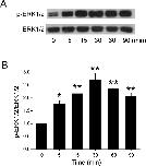 Figure 5. Effects of formaldehyde onERK1/2 phosphorylation in H441 cells.(A) Representative western blot of phosphorylated ERK1/2 in protein extracted from H441 cells exposed to 200âμM formaldehyde for 0â90âmin. Blots were immunostained with total ERK1/2 as a loading control. (B) Graphical representation of data obtained from three sets of western blots and quantified using gray analysis (p-ERK1/2/ERK1/2). Data are shown as the meanâ±âSE, *Pâ<â0.05, **Pâ<â0.01, compared with control.