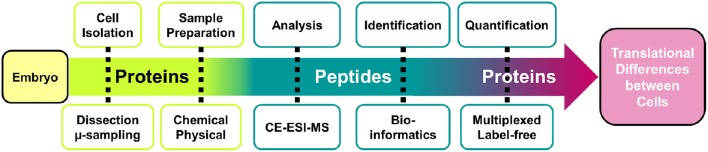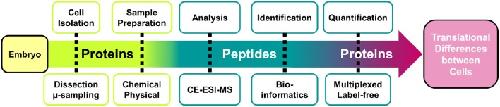 Direct measurement of protein expression with single-cell resolution promises to deepen the understanding of the basic molecular processes during normal and impaired development. High-resolution mass spectrometry provides detailed coverage of the proteomic composition of large numbers of cells. Here we discuss recent mass spectrometry developments based on single-cell capillary electrophoresis that extend discovery proteomics to sufficient sensitivity to enable the measurement of proteins in single cells. The single-cell mass spectrometry system is used to detect a large number of proteins in single embryonic cells in the 16-cell embryo of the South African clawed frog (Xenopus laevis) that give rise to distinct tissue types. Single-cell measurements of protein expression provide complementary information on gene transcription during early development of the vertebrate embryo, raising a potential to understand how differential gene expression coordinates normal cell heterogeneity during development.
