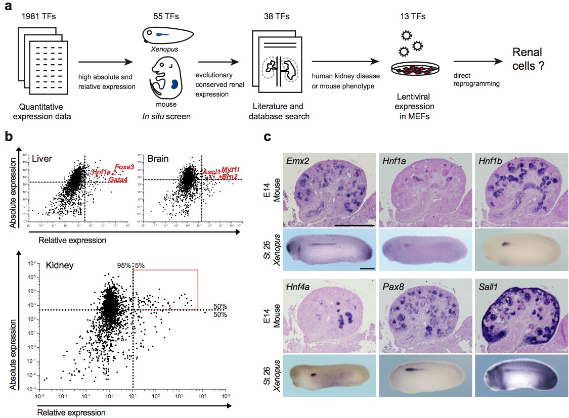 Direct reprogramming by forced expression of transcription factors can convert one cell type into another. Thus, desired cell types can be generated bypassing pluripotency. However, direct reprogramming towards renal cells remains an unmet challenge. Here, we identify renal cell fate-inducing factors on the basis of their tissue specificity and evolutionarily conserved expression, and demonstrate that combined expression of Emx2, Hnf1b, Hnf4a and Pax8 converts mouse and human fibroblasts into induced renal tubular epithelial cells (iRECs). iRECs exhibit epithelial features, a global gene expression profile resembling their native counterparts, functional properties of differentiated renal tubule cells and sensitivity to nephrotoxic substances. Furthermore, iRECs integrate into kidney organoids and form tubules in decellularized kidneys. Our approach demonstrates that reprogramming factors can be identified by targeted in silico analysis. Renal tubular epithelial cells generated ex vivo by forced expression of transcription factors may facilitate disease modelling, drug and nephrotoxicity testing, and regenerative approaches.