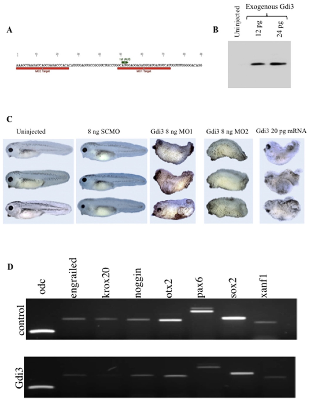 electrophoresis tank thatwas stainedwith Coomassie Brilliant Blue. (C) Embryos injected with either morpholino for protein level knock-down or GDI3mRNA for protein over-expression