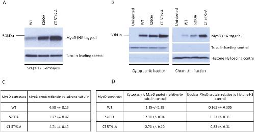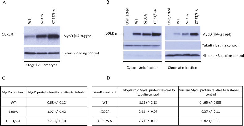 Fig. 4. CT 5T/S-A MyoD shows enhanced protein stability and enhanced chromatin binding relative to both WT and S200A MyoD. Embryos were injected with 200 pg mRNA encoding HA-tagged MyoD constructs as indicated, and western blot analysis was performed on whole embryo extracts at stage 12.5 (A) or cross linking and cytoplasmic/chromatin extracts at stage 13 (B). MyoD protein density was quantified relative to tubulin loading control for whole embryo extracts (C) and cytoplasmic fractions (D), or relative to histone H3 for chromatin fractions (D). Mean values are shown from independent duplicate samples with standard error of the mean.