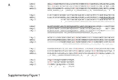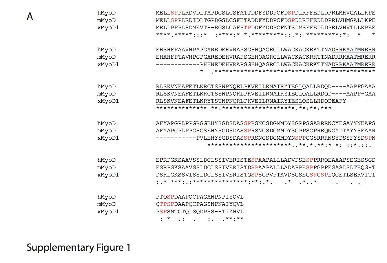 Supplementary Fig. 1Protein sequence alignment of human, mouse and Xenopus MyoD. The bHLH domain is underlined and SP/TP sites are highlighted in red. A consensus line is also shown below the alignment to indicate the degree of conservation at each position: Residues may be identical (*), strongly conserved (:) or weakly conserved (.).