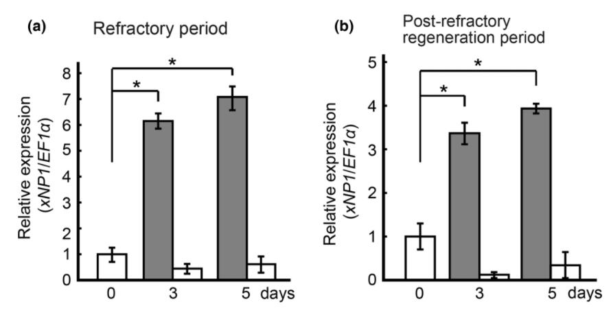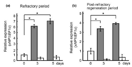 Real-time RTâPCR of xNP1-transcripts in tail tissues of the ârefractoryâ and âpost-refractory regenerationâ period tadpoles on days 0, 3, and 5 after amputation. Real time RTâPCR was performed using total RNA extracted from the tail stumps (2-mm wide tail tissues) of the (a) ârefractoryâ and (b) âpost-refractory regenerationâ period tadpoles on days 0, 3, and 5 after amputation. As a control, we used total RNA extracted from tissues of the same tail parts: for example, 2-mm wide tissues at the distal one-third of the intact tails from tadpoles at the same developmental stages, on days 3 and 5 after the tails of the experimental group were amputated. The shaded and open bars indicate amputated tail stumps and intact tails, respectively. The numbers of individuals used for the experiments were: 16â24 à 3â4 lots and 2â5 à 2â4 lots for ârefractoryâ and âpost-refractory regenerationâ periods, respectively. The relative amounts of xNP1 transcripts determined by real-time RTâPCR were obtained by taking the value at day 0 as 1 for each (a) ârefractoryâ period and (b) âpost-refractory regenerationâ period after normalization relative to elongation factor 1α (EF1α) transcript levels. The bars indicate standard errors. Asterisks indicate statistically significant differences: P < 0.05 using the Tukey-Kramer method. image, Intact tails; image, Amputated tail stumps. |