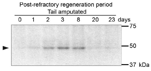 Immunoblotting of xNP1 in the regenerating tails of the âpost-refractory regenerationâ period tadpoles. Immunoblotting was performed using homogenates of regenerating tails of the âpost-refractory regenerationâ period tadpoles on days 0, 1, 2, 3, 8, 20, and 23 after amputation, and the anti-xNP1 antibody. The positions of bands for xNP1 are indicated with an arrowhead. The numbers at the right of panels indicate positions of molecular weight markers in kDa. |