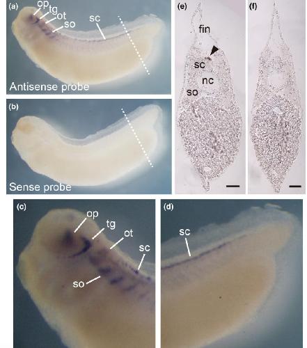 Expression analysis by in situ hybridization of xNP1 in tailbud embryos. In situ hybridization was performed using tailbud embryos (stage 33/34) with (a, câe) antisense or (b and f) sense DIG-labeled xNP1 probe. (c and d) are magnified views of the head and tail regions of (a). In situ hybridization using transverse sections are also performed using (e) antisense and (f) sense xNP1 probes. Approximate position of the sections is indicated by dashed lines in (a and b), respectively. The arrowhead in panel (e) indicates the signal at spinal cord. The bars in (e and f) indicate 50 μm. nc, notochord; op, optic vesicle; ot, otic vesicle; sc, spinal cord; so, somite; tg, trigeminal placode. |
