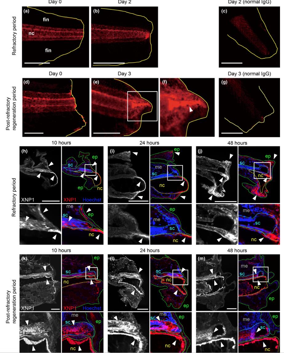 Expression analysis by immunostaining of xNP1 in the amputated tail stumps and regenerating tails of the ârefractoryâ and âpost-refractory regenerationâ period tadpoles. Immunostaining was performed using amputated tail stumps of the refractoryâ period tadpoles on (a) day 0 and (b and c) days 2 after amputation, and regenerating tails of the âpost-refractory regenerationâ period tadpoles on (d) day 0 and (eâg) days 3 after amputation, with the anti-xNP1 antibody (a, b, dâf) or the same concentration of normal IgG as negative controls (c and g), respectively. The yellow lines indicate outlines of the sampled tails. Panel (f) indicates a magnified view of the boxed area in (e). The arrowhead in panel (f) indicates regenerating notochord. We also performed immunostaining on sectioned tails of (hâj) the ârefractoryâ period and (kâm) the âpost-refractory regenerationâ period tadpoles at 10, 24 and 48 h after amputation. (hâm) Upper left, immunofluorescence images of xNP1 staining; Upper right, merged images of xNP1 staining (red) and Hoechst 33342 staining (blue). the position of the tissues is indicated with colored and dashed lines. sc (light blue), spinal cord; nc (yellow), notochord; ms (gray), mesenchyme; ep (green), epidermis; Lower left, magnified view of xNP1 staining of the boxed area in upper right; Lower right, magnified view of merged images of the boxed area. Arrowheads in (hâm) indicate signals. The bars indicate (aâc) 1 mm, (d, e and g) 0.5 mm, and (hâm) 0.2 mm, respectively. |